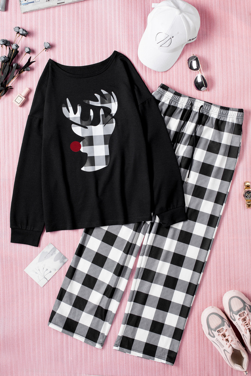 Christmas Plaid Reindeer Graphic Top and Pants Lounge Set