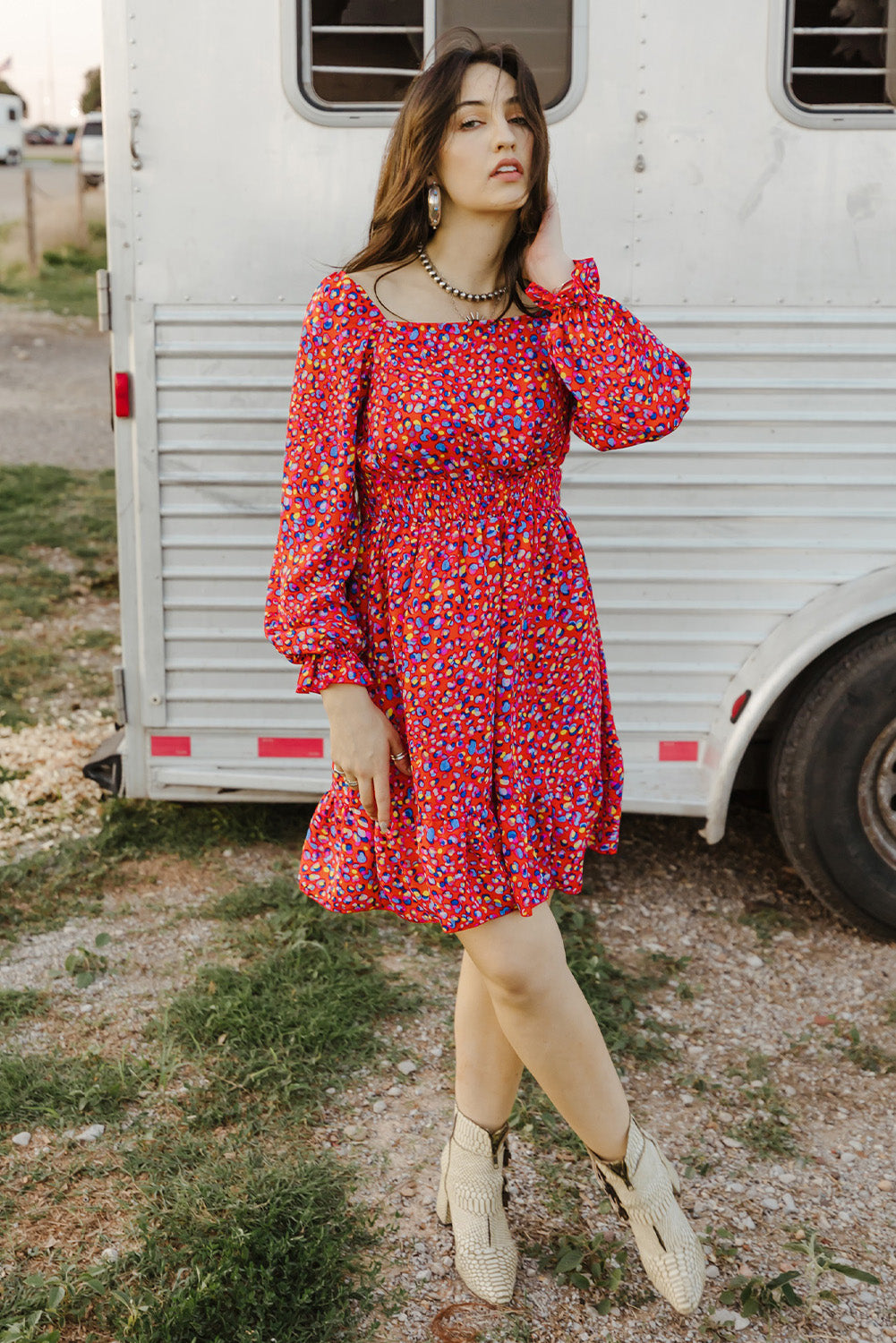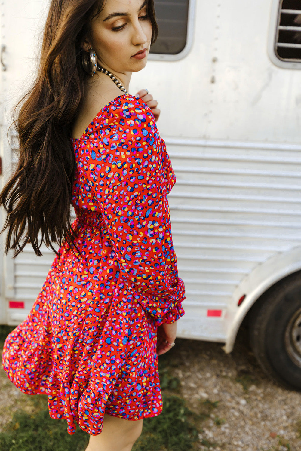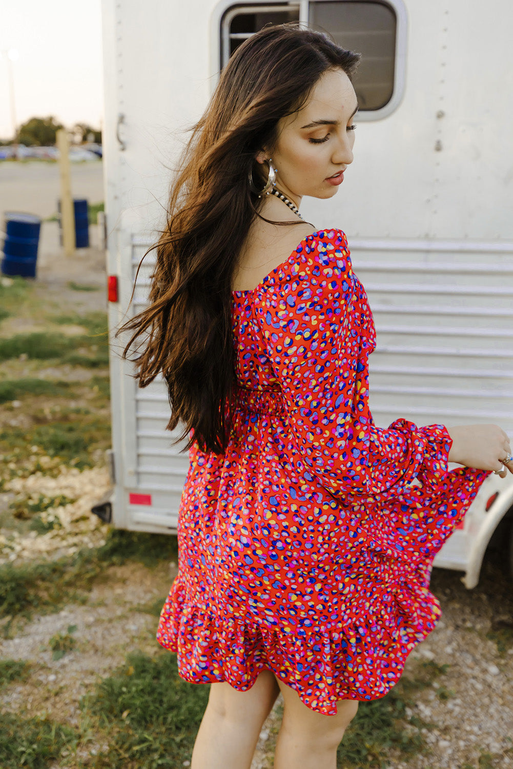 Printed Square Neck Flounce Sleeve Ruffle Hem Dress